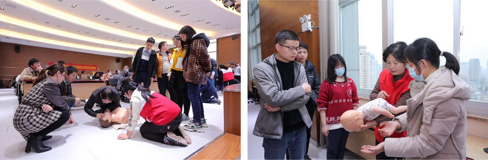 實(shí)踐出真知,配合講座的應(yīng)急救護(hù)實(shí)操和消防演習(xí)讓參與培訓(xùn)的員工更親身體驗(yàn)了一次現(xiàn)場(chǎng)急救和高樓逃生。手工心肺復(fù)蘇、心肺復(fù)蘇儀(AED)、人工呼吸等操作,老師一遍遍的耐心糾正動(dòng)作,講解注意事項(xiàng),爭(zhēng)取讓每個(gè)人都能學(xué)會(huì)。隨著消防警報(bào)和發(fā)煙裝置的開(kāi)啟,應(yīng)急疏散拉開(kāi)序幕,員工們服從指揮,有序疏散到1樓廣場(chǎng)集合。隨后在消防戰(zhàn)士的指導(dǎo)下,每位同事親手使用了一次滅火器滅火。集中培訓(xùn)之外,集團(tuán)還安排了緩降器和防毒面罩使用指導(dǎo),員工學(xué)習(xí)了使用技巧并親身使用了相關(guān)器材。