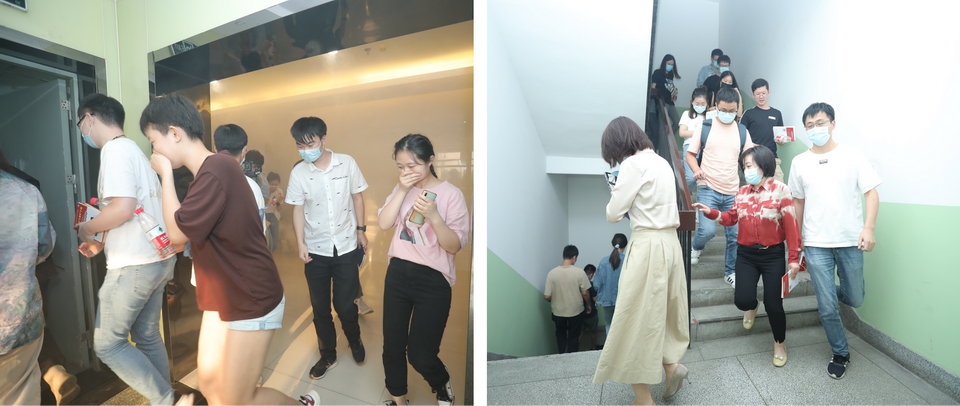 隨著消防警報和發煙裝置的開啟,應急疏散拉開序幕,員工們彎腰掩口鼻,服從指揮,有序疏散到安全區域。