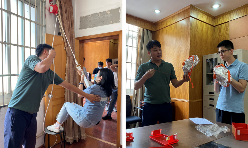 在消防戰士的指導下,員工們有序參與滅火器實操訓練,每個人都親手使用一次滅火器。此外,緩降器和防護面罩使用培訓及實操均在專業老師的指導下完成。