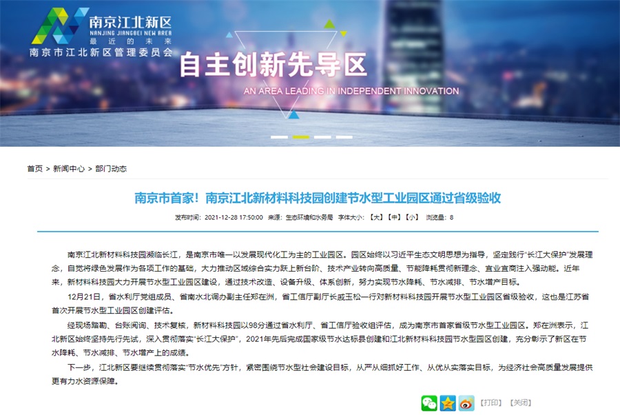 水文所助力南京江北新材料科技園獲評首批“江蘇省節水型工業園區”