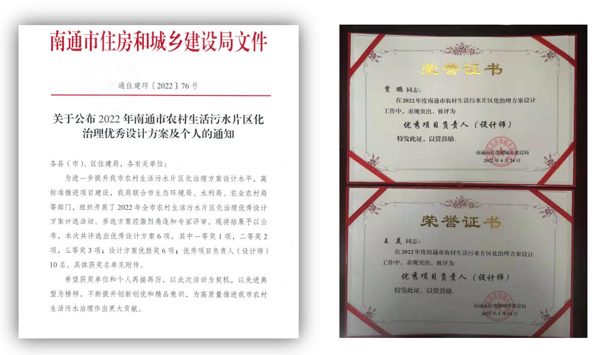 工程設(shè)計(jì)分院獲評(píng)南通市農(nóng)村生活污水片區(qū)化治理優(yōu)秀設(shè)計(jì)方案及優(yōu)秀設(shè)計(jì)師