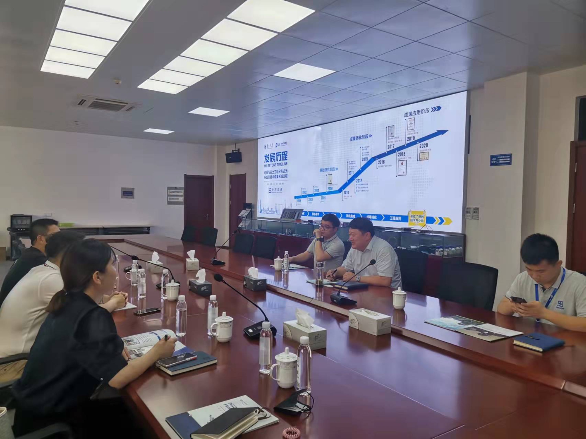 考察組一行到蘇州工業(yè)園區(qū)、陽澄湖隧道口進行項目現(xiàn)場實地考察。座談會上,南智傳感總經(jīng)理魏廣慶博士詳細介紹了南智公司光纖傳感技術(shù)的發(fā)展歷程、技術(shù)體系和傳感產(chǎn)品,重點介紹了分布式光纖傳感技術(shù)在管網(wǎng)監(jiān)測系統(tǒng)中的最新應(yīng)用及進展。徐祥副院長對南智公司開發(fā)和應(yīng)用的光纖傳感技術(shù)產(chǎn)品和監(jiān)測系統(tǒng)等工作表示充分肯定,雙方就分布式光纖傳感技術(shù)在城鎮(zhèn)排水行業(yè)及環(huán)境監(jiān)測領(lǐng)域中的實際應(yīng)用進行了深入探討和交流。會后,考察組一行參觀了南智公司傳感器生產(chǎn)與測試中心、工程監(jiān)測系統(tǒng)平臺、市內(nèi)模擬試驗場等。