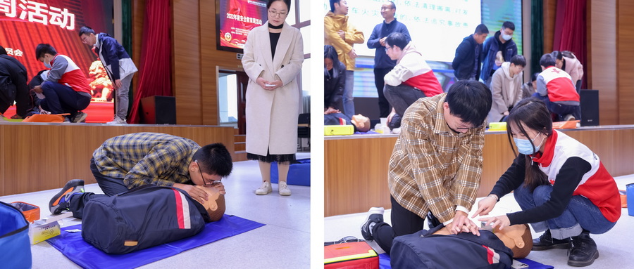 線下培訓涉及應急救護知識、工作期間安全知識、消防安全知識三個部分。首先由江蘇省紅十字會專家團隊進行應急救護培訓,專家深入講解了心肺復蘇、氣道異物梗阻、創傷救護等應急救護知識,并現場演示了常用的應急救護手法和心肺復蘇操作。