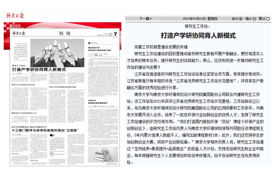 近日,我國(guó)權(quán)威科技媒體《科技日?qǐng)?bào)》發(fā)布專(zhuān)題報(bào)道“研究生工作站:打造產(chǎn)教融合協(xié)同育人新模式”。報(bào)道強(qiáng)調(diào)了研究生工作站在推動(dòng)我國(guó)研究生培養(yǎng)模式改革、促進(jìn)產(chǎn)學(xué)研融合等方面發(fā)揮的重要作用,并以南京大學(xué)環(huán)境學(xué)院與南大環(huán)規(guī)院聯(lián)合共建的研究生工作站為案例,著重報(bào)道了該站充分依托雙方優(yōu)勢(shì)資源條件,產(chǎn)教深度融合,培養(yǎng)創(chuàng)新創(chuàng)業(yè)人才,提升學(xué)生素質(zhì)和就業(yè)品質(zhì)的嶄新模式和突出成效。