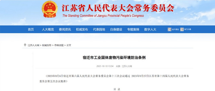 近日,江蘇省人大常委會批準實施了《宿遷市工業固體廢物污染環境防治條例》。該項目由南大環規院環境咨詢三所提供全過程技術支撐。