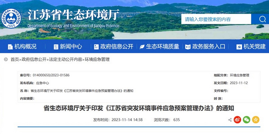 《江蘇省突發環境事件應急預案管理辦法》正式印發