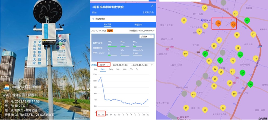 2023年冬季為厄爾尼諾事件控制下的暖冬,外部傳輸污染頻繁過境,2023年10月啟動本項目時,啟東PM2.5年均值位于全省第二,項目組在啟東市建設一套“監測監控+監管平臺+專家團隊”的服務模式,從“點”、“線”、“面”多維度出發,構建了一套精準化、立體化監測體系,通過采取在線監控和現場巡查相結合的手段,精準溯源污染,有效壓降本地源排放,保障啟東市2023年PM2.5年均值連續第五年蟬聯全省第一。