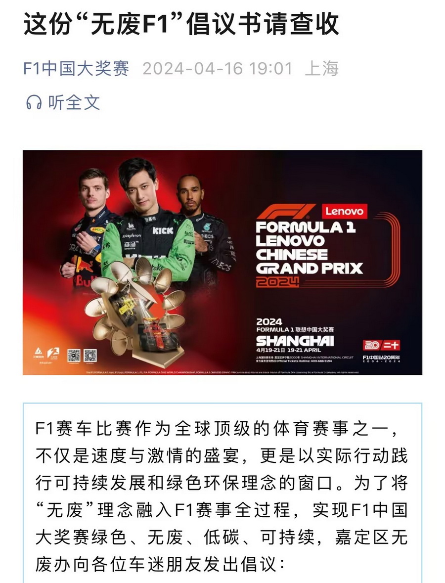 F1中國大獎賽官方發布“無廢F1”倡議